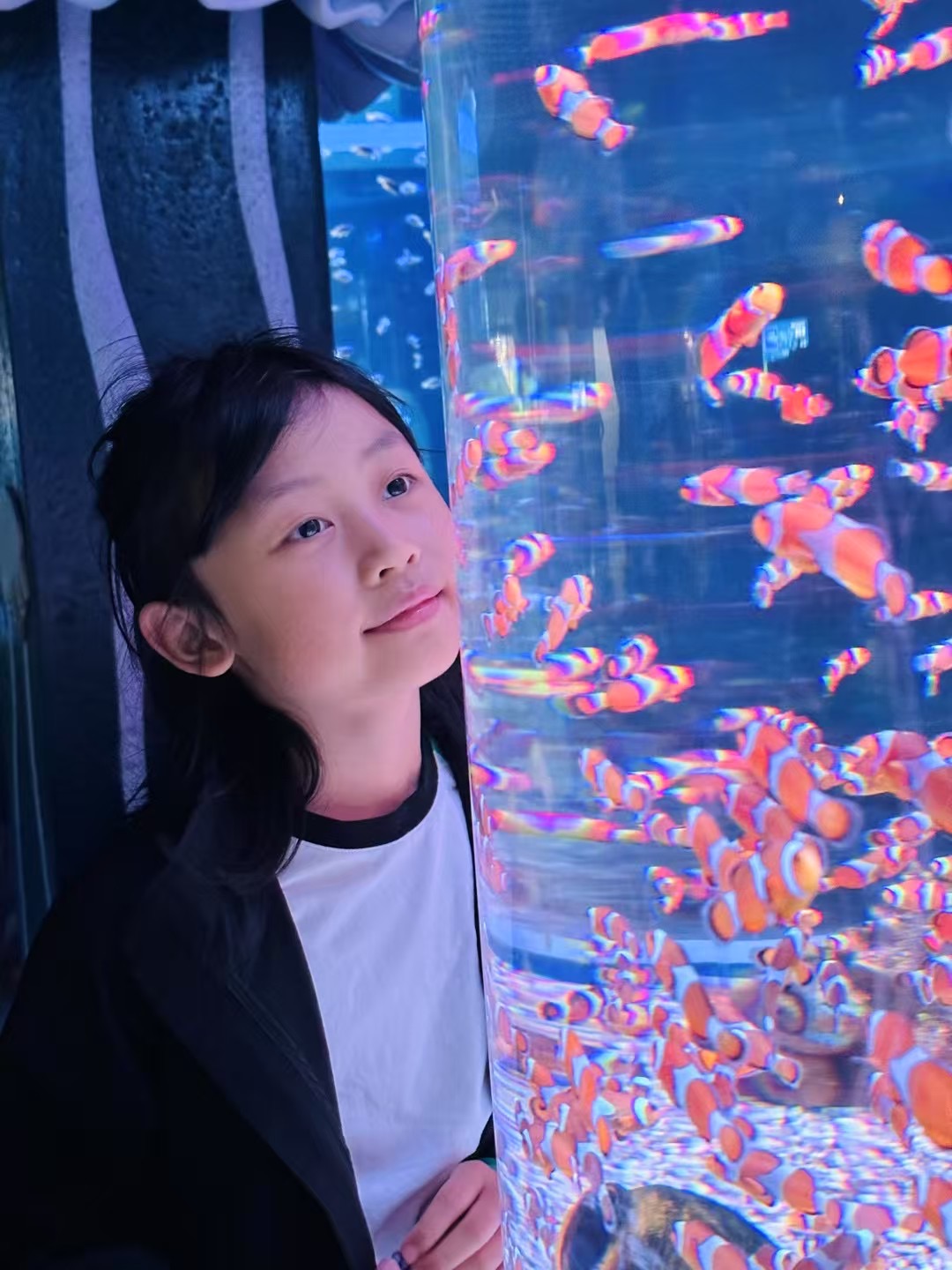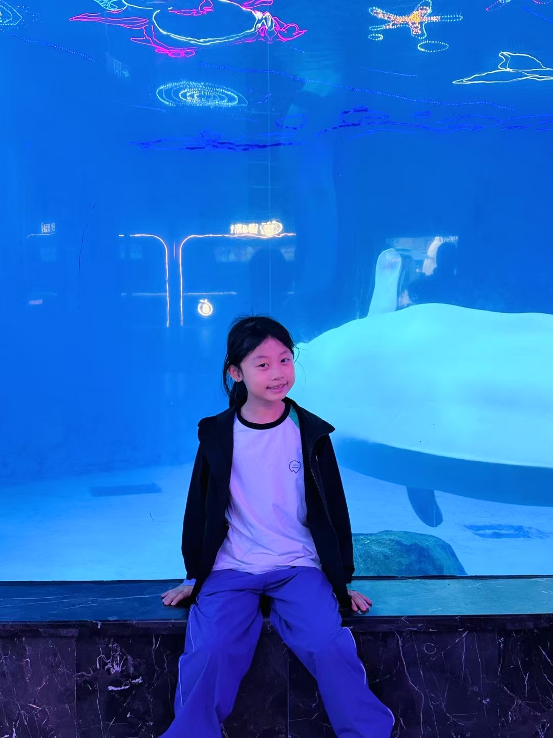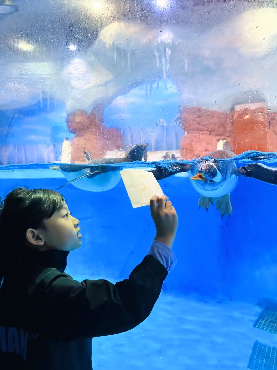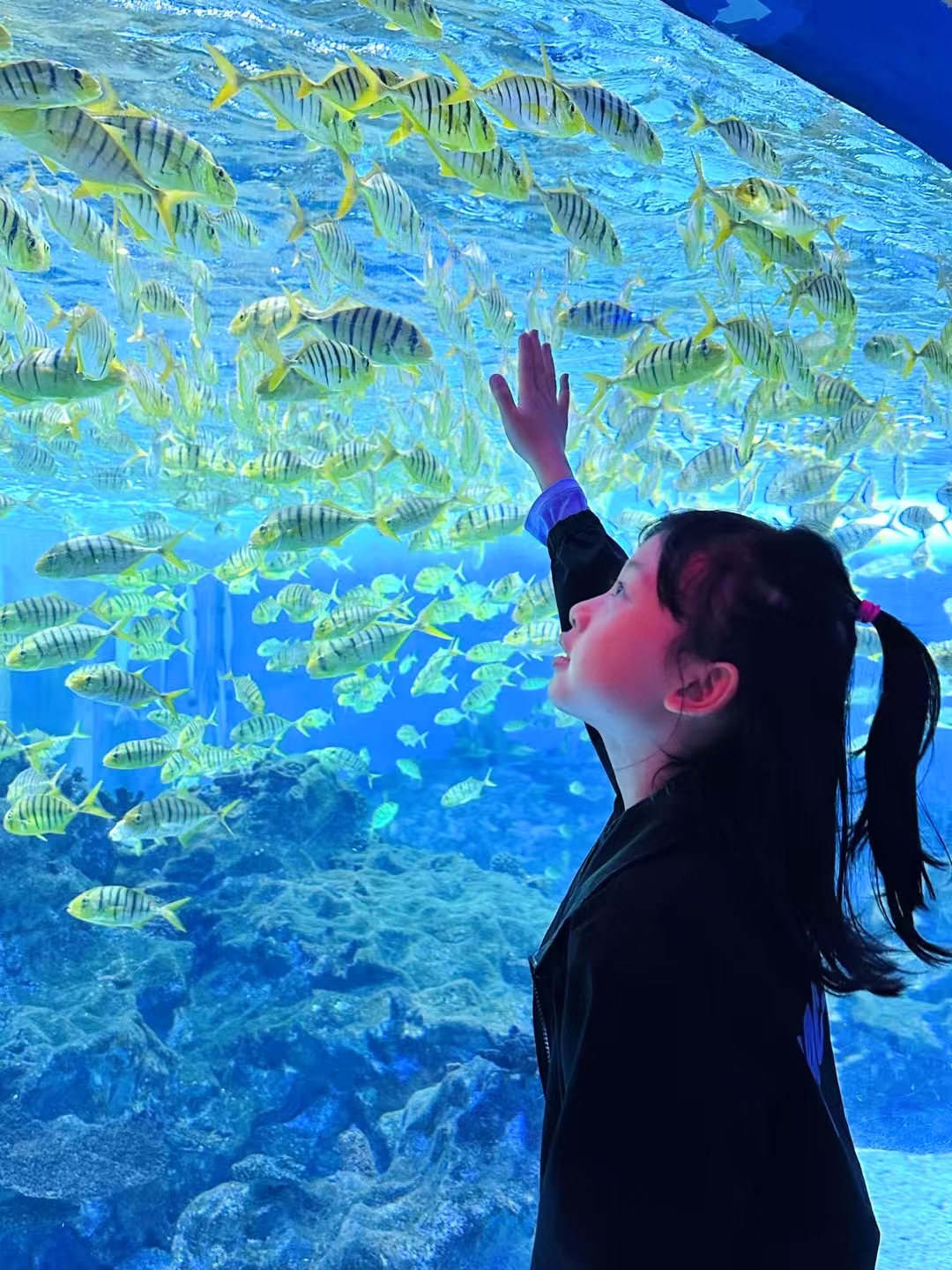 海底世界更神奇!胖嘟嘟的企鹅摇摇摆摆走路,突然“扑通”跳进水里,游得像火箭一样快!海豚宝宝“啾啾”叫着顶球,溅起的水花洒在我脸上,逗得我咯咯笑。还有五彩斑斓的热带鱼,在珊瑚里钻来钻去,像一群穿花裙子跳舞的小精灵!
